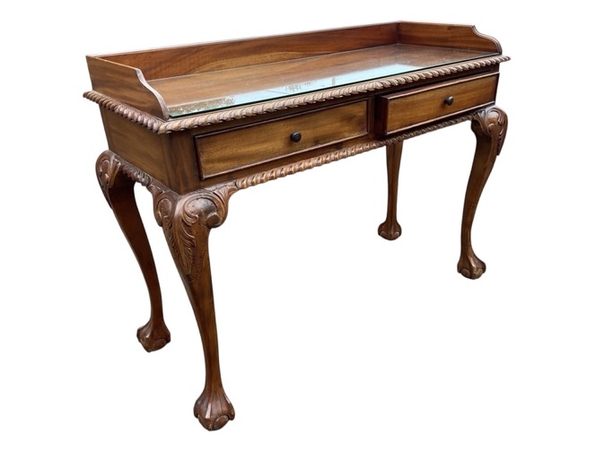 A Victorian style mahogany side table with shaped back and plate glass to top, having gadroon carved mouldings framing two panelled frieze drawers, raised on acanthus carved cabriole legs with ball & claw feet. (43.5in x 18in x 33.5in)