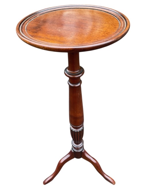 A mahogany jardiniere stand with circular tray top on turned column with fluting, above tripod legs. (36in)