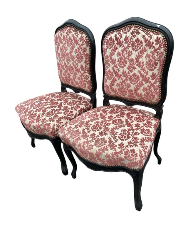 A pair of Victorian ebonised brocade side chairs with upholstered shield shaped moulded backs with studding above sprung seats, raised on cabriole legs. (2)