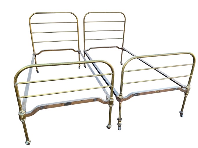 A pair of Edwardian Heal & Son brass beds of tubular construction having rounded ends, the cornerposts on castors joined by angleiron side rails. (36.75in x 79.25in x 46.5in) (2)