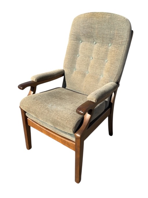 A button upholstered elm armchair with rounded back and padded armrests framing a sprung seat with loose cushion, raised on rounded tapering legs.