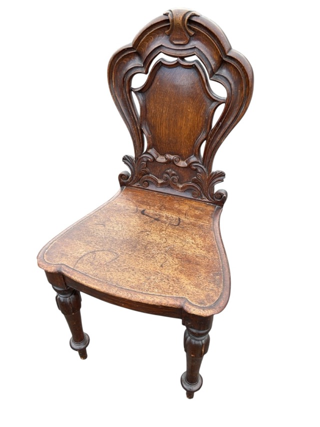 A Victorian oak hall chair with pierced scroll carved shield back above a tapering shaped seat, raised on turned tapering legs with lappet carved shoulders.