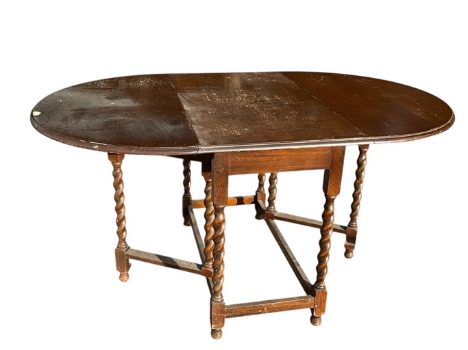 An oak drop-leaf dining table, having two leaves opening on twisted swing legs, with stretchers and bun feet. (58in x 35.75in 29in)