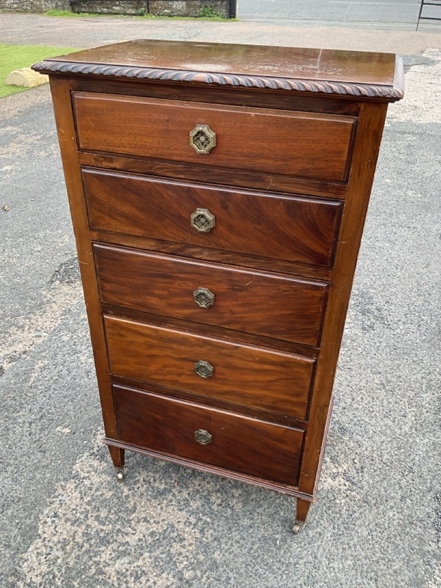 A mahogany cabinet with five drawers mounted with square cut-corner brass drop handles, the top with gadrooned carved edge, raised on square tapering legs with brass castors. (23.25in x 15.75in x 42.25in)