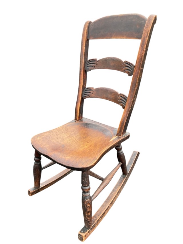 A nineteenth century country birch rocking chair with scrolled chisel carving to back rails, the solid shaped seat on turned legs with shaped rockers.