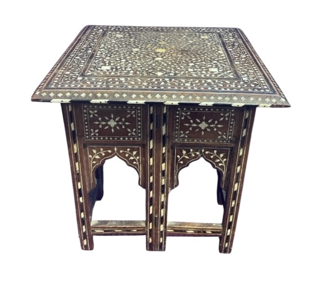 An antique Indian Hoshiarpur bone and ebony chequer strung teak occasional table with square top above a panelled apron raised on square legs with ogee arched brackets with allover floral and foliate bone inlay. (16in x 16in x 16in)