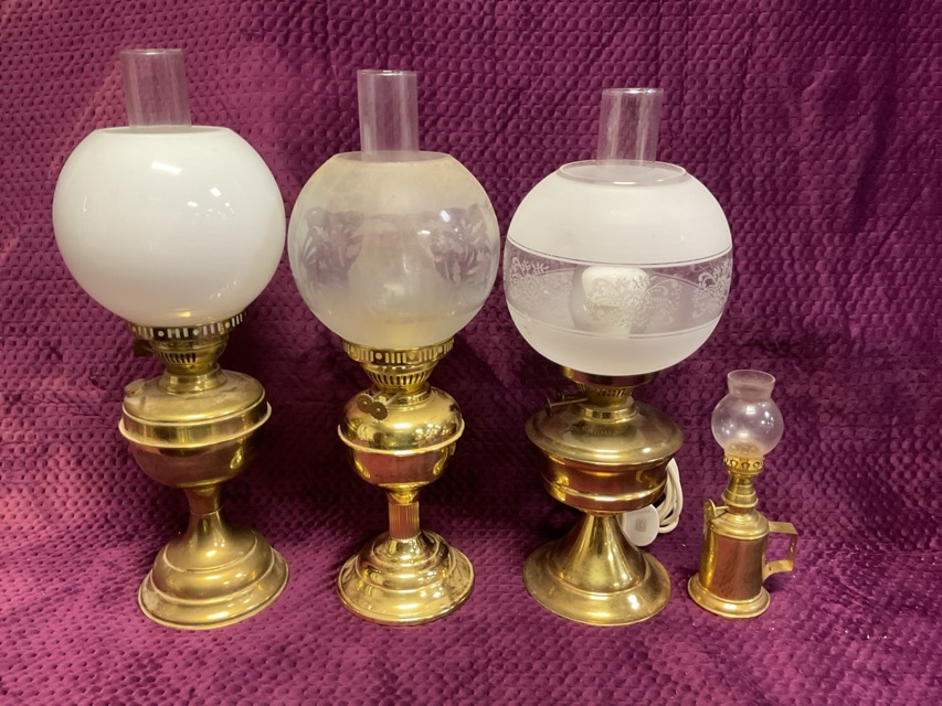 Four brass oil lamps with glass shades & chimneys - one electrified. (4)