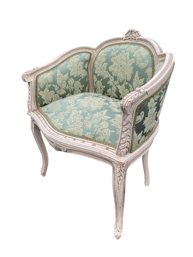 A Louis XVI style upholstered painted fauteuil with arched back and side panels framed by moulded rails with scrolled leaf carvings, the bowfronted sprung seat with conforming carved decoration raised on cabriole legs.