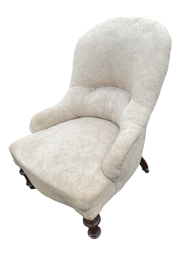 A Victorian spoon-back chair, button upholstered in floral quilted material, having sprung seat raised on turned legs with castors.