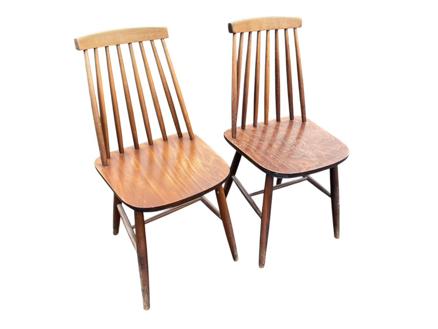 A pair of 60s spindleback chairs with rounded seats raised on turned legs & stretchers. (2)