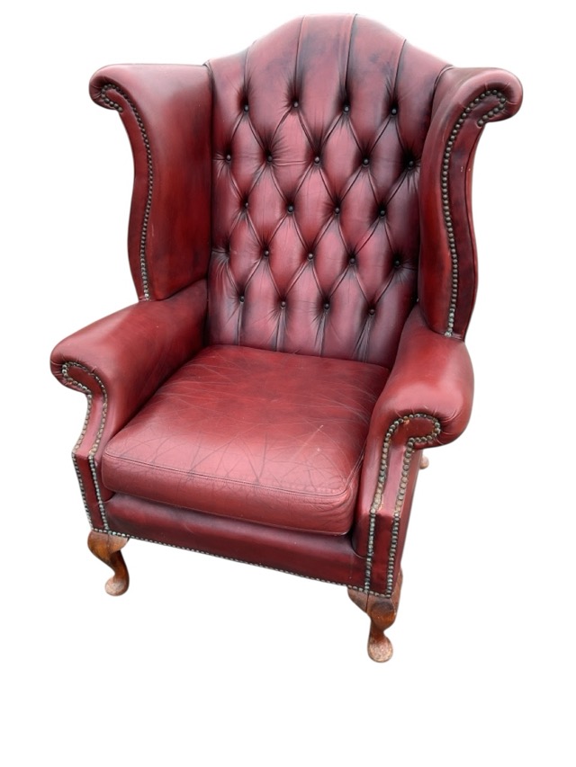 A Georgian style leather button upholstered wing armchair with arched back and scrolled studded wings above padded arms, the sprung seat with loose cushion raised on cabriole legs.