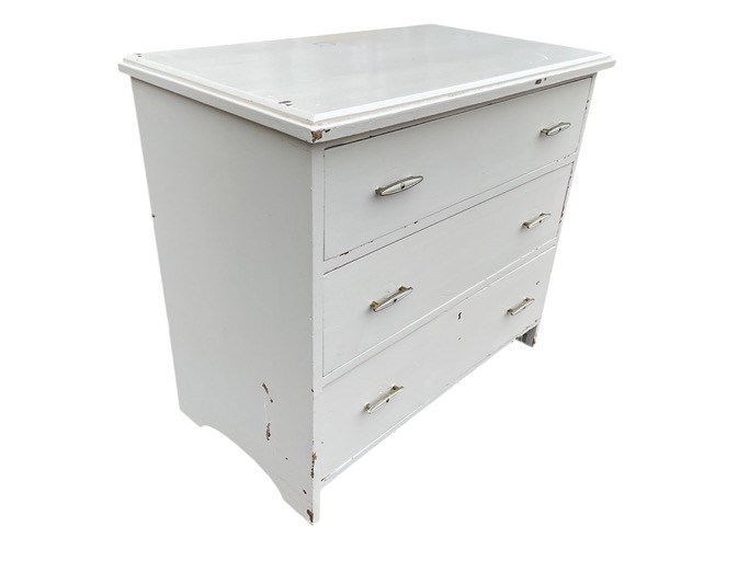 A painted Victorian pine chest of three long drawers with chamfered rectangular top. (35.25in x 19.75in x 31in)