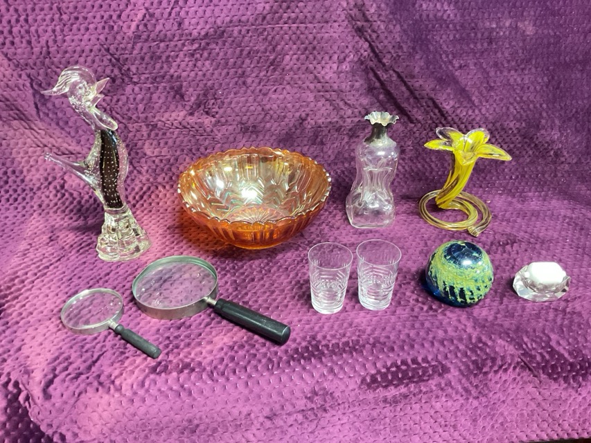 Venetian style glass cockerel figure and flowerhead vase, a carnival glass fruit bowl, a Victorian spirit decanter with hallmarked silver collar - London 1889, an unmarked Mdina paperweight, a pair of Edinburgh Crystal tumblers, a Victorian stamp wetter, and two magnifying glasses. (10)