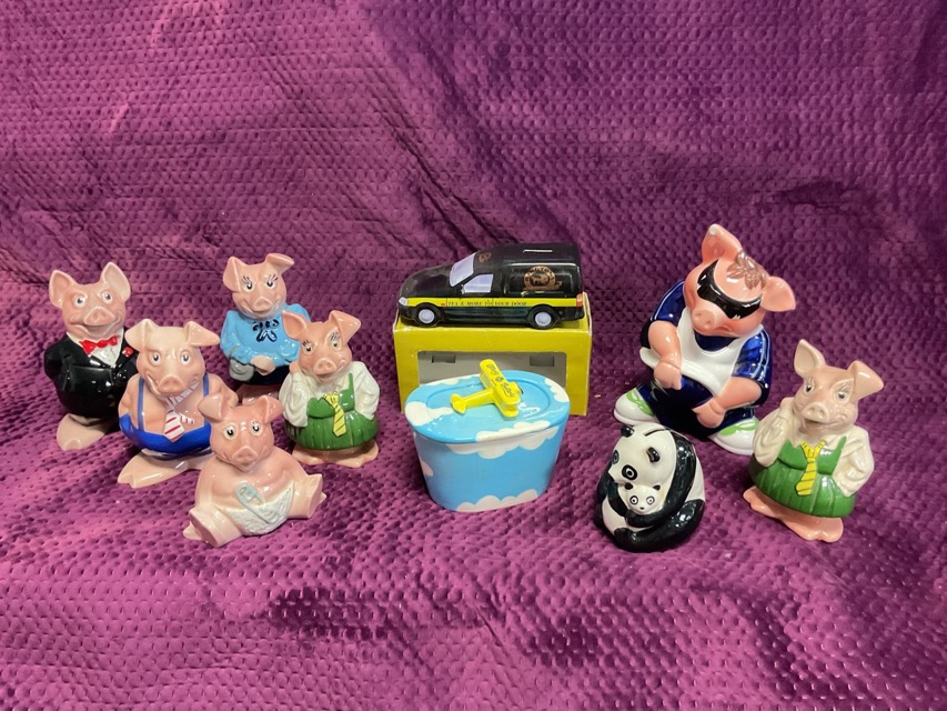 A collection of ceramic money boxes - a complete Wade five-piece Nat West piggy bank family and an additional Annabel, a Paul Cardew Master OD Banker piggy bank, a panda and cub example, a boxed Ringtons Ford Escort money box, and an Utterly Butterly biplane butter tub. (10)