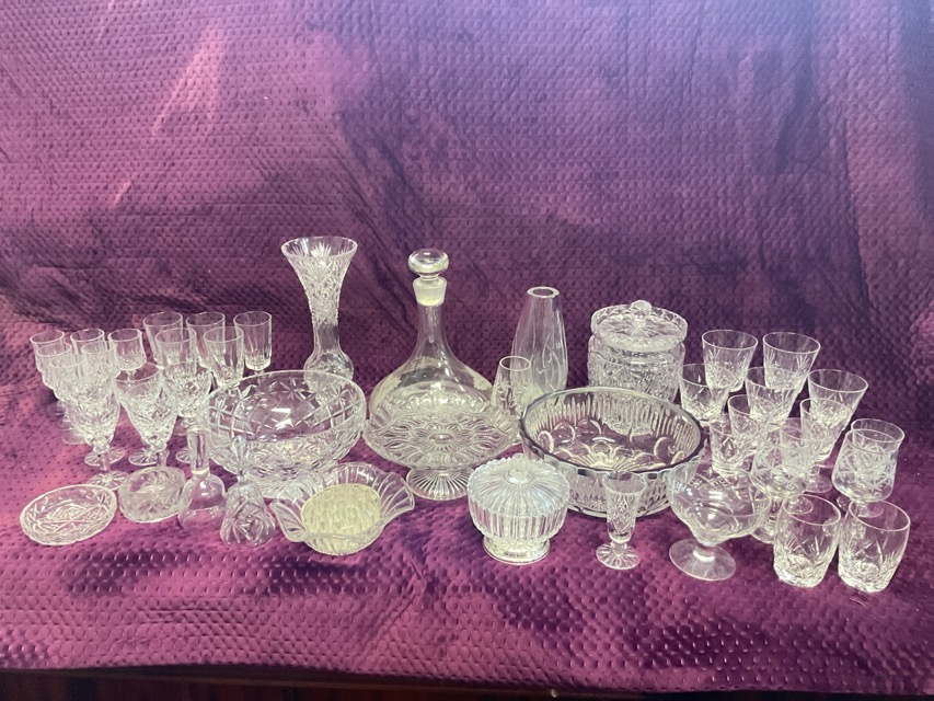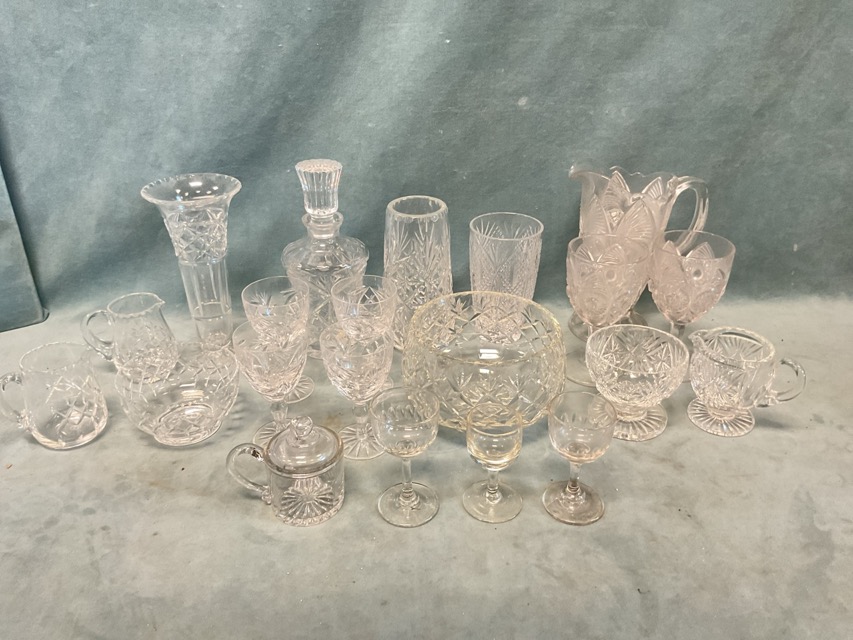 Miscellaneous cut glass including a spirit decanter m a jug and pair of goblets, wine glasses, cream and sugar sets, a salad bowl, etc. (A lot)