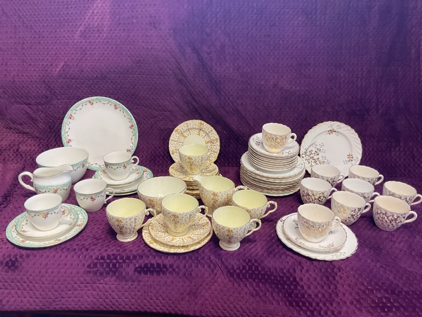Three porcelain tea services - Collingwoods in the Dale pattern; a Royal Grafton in the Chantilly pattern; and an Edwardian service handpainted with forget-me-nots and scrolling foliage in gilt and turquoise - cups, saucers, teaplates, cream jugs, sugar bowls, and a cake plate. (A lot)