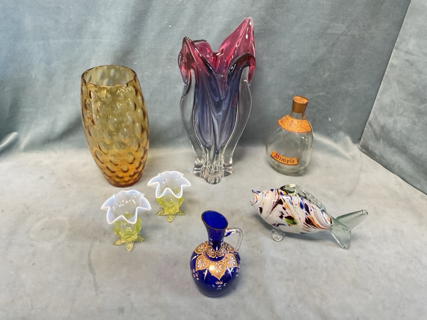 A large Josef Hospodka Chribska Bohemian art glass vase - 15in; a 69s amber dimplled vase; a Romanian hand formed Murano style fish with mottled body; a pair of Victorian Vaseline glass flowerhead form vases, a Victorian blue and enamelled glass vase, and a Dimple whisky bottle. (7)