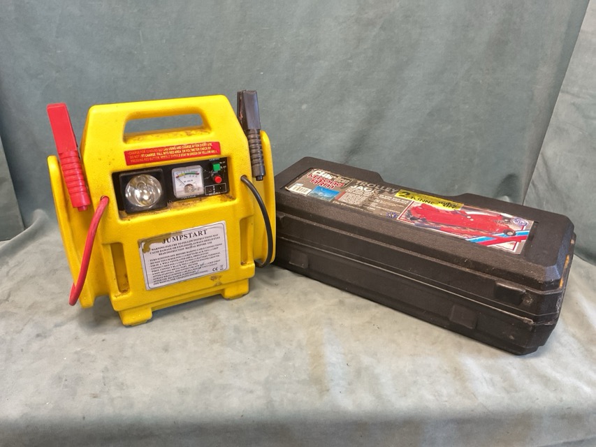 A cased Clarke 2 tonne trolley jack; and an electric jumpstart machine. (2)