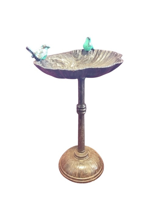 A cast iron birdbath with two birds perched on a shell form bowl raised on a cylindrical knopped column with domed base. (22in)