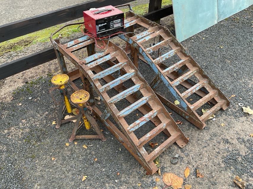 A pair of angleiron type vehicle ramps; a Eintell electric 10amp battery charger; and a pair of pyramidal car jacks with adjustable columns. (3)