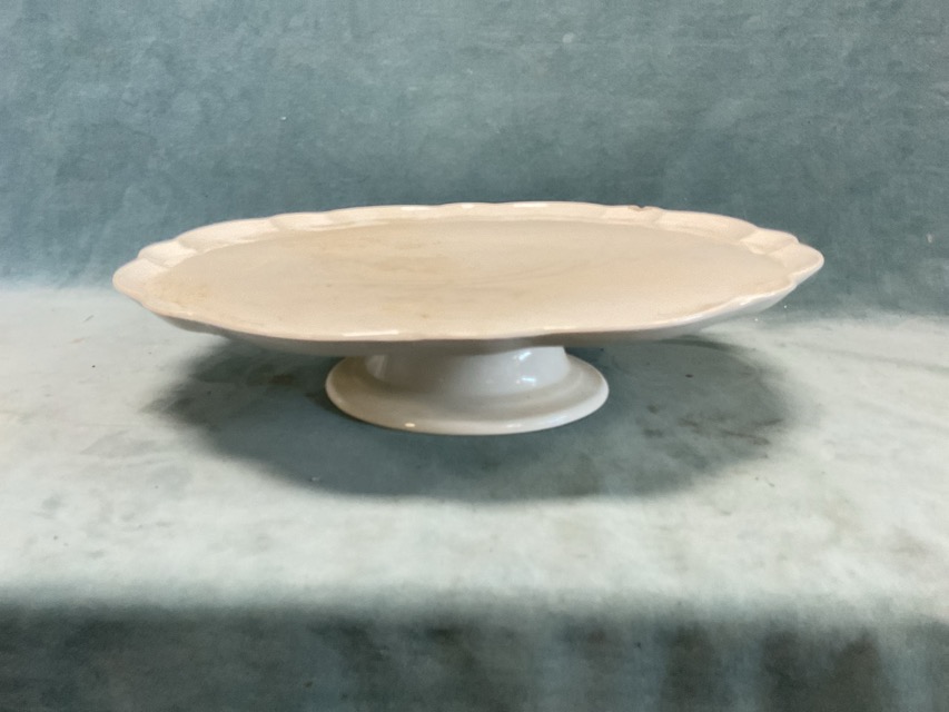 A Victorian ceramic Lazy Susan with scalloped circular top rotating on a domed base with circular foot - 18.5in; two Victorian pierced brass trivets, and an oval silver plated cruet stand with pierced sides. (4)