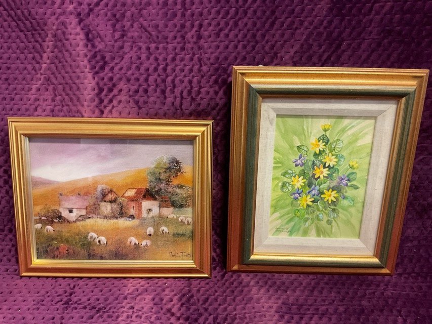 Margery Stephenson, watercolour, spring flowers, signed, mounted & framed; and Nancie Foster, gilt framed oileograph of Old Earle Mill Wooler with sheep in foreground. (2)
