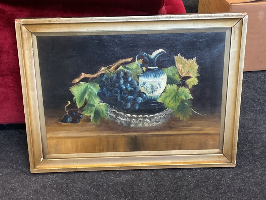 M Wonley, Victorian oil on canvas, still life with grapes & vine leaves in a glass bowl, with blue ewer, signed and framed. (19.25in x 13.25in)