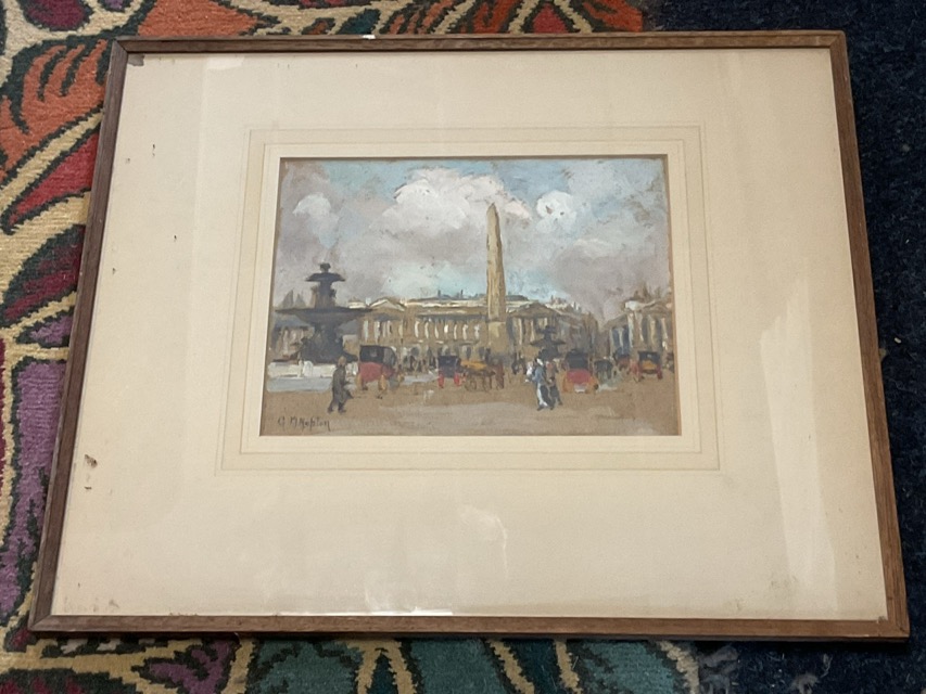 Gwendoline Margaret Hopton, oil on card, impressionistic early C20th view of the Place de la Concorde, Paris with the obelisk, taxis and figures, signed, mounted and framed. (9in x 7in)
