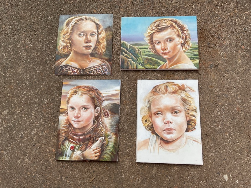 Manuella Norris, oil on board, portrait of a girl in renaissance costume; and three oil portraits of young girls. (4)