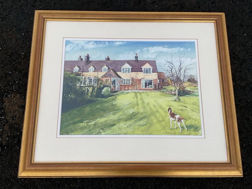 Kit Leese, gouache, study of a house with dog on lawn, signed, mounted & framed. (17.25in x 12.5in)
