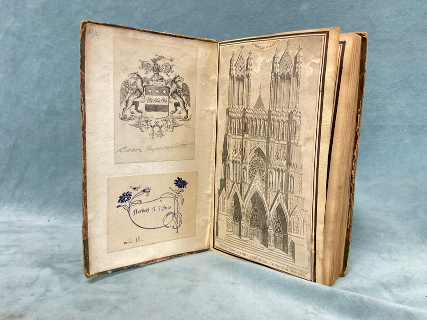 A C19th quarter leather bound album containing 107 pasted-in C17th-C19th engravings of British and European great houses, cathedrals, topography, views, sculpture, ruins, etc., bearing the bookplate of Italian sculptor Baron Carlo Marochetti.