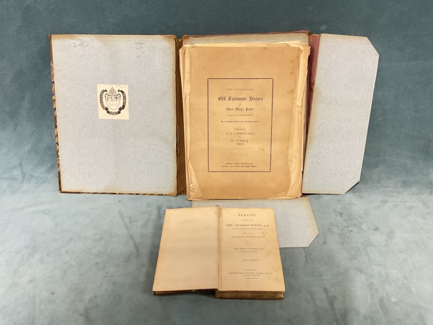 A portfolio of the Illustrations of Old Testament History in Queen Marys Psalter, numerous loose leaf engravings by Nathaniel Westlake, published by Joseph Masters &Co - London 1865; and Remains of the Late Rev Charles Wolfe AB, by John A Russell, leather bound, 6th edition - London 1836. (2)