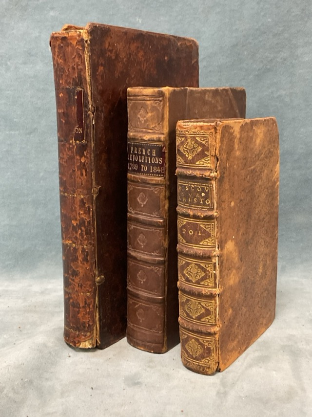 The French Revolutions from 1789 to 1848 by TW Redhead, vols 1 & 2 together quarter leather bound - Edinburgh 1848; Discours sur l’Histoire Universel by Jacques Bossuet, vol 1 - Amsterdam 1702; and Reflections on the Revolution in France by Edmund Burke, 11th edition - London 1791. (3)