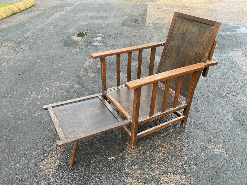 An unusual 30s oak armchair with platform arms on lathes above a seat, converting from chair to lounger or bed.