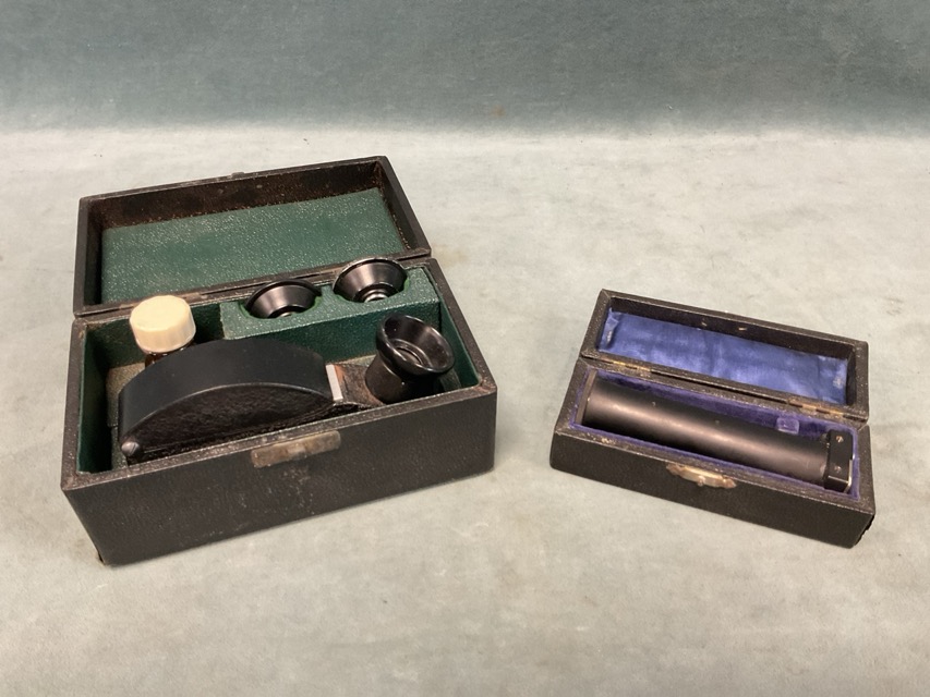 Two gemological instruments - a cased refractometer by Rayner - New Bond Street London, with two additional lenses and refractive index liquid bottle; and a cased hand spectroscope/spectrometer by Beck - London. (2)