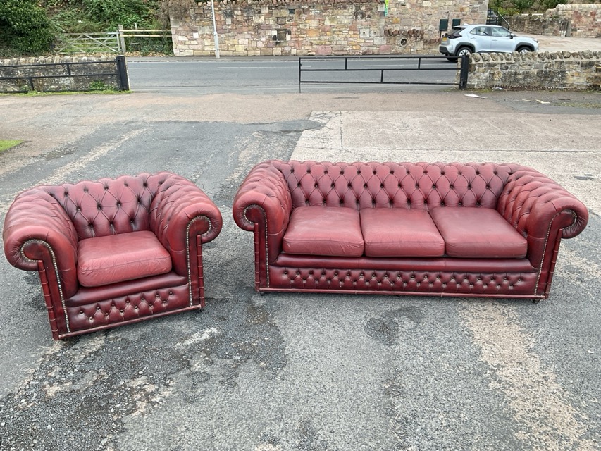 A leather upholstered three-seater chesterfield sofa - 78in, and matching armchair with outscrolled buttoned backs and arms above rectangular seats with loose cushions and buttoned aprons on castors. (2)