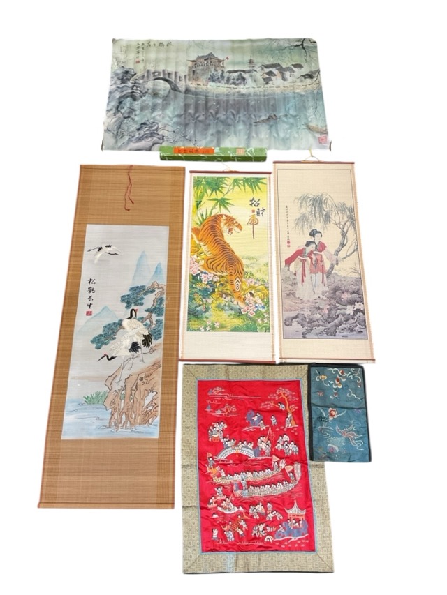 A Chinese painted & embroidered bamboo scroll; two printed paper scrolls; a Chinese embroidered silk pouch, decorated with fish; a textile panel depicting boats; and a print on silk depicting a temple. (6)