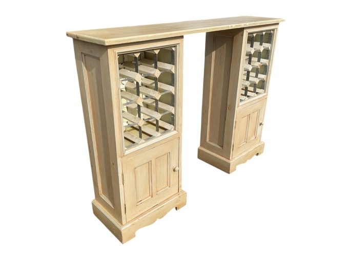 A painted winerack cabinet with a pair of panelled column pedestals with cupboards beneath a rectangular platform, the plinths with shaped aprons. (48.5in x 11in x 36.25 in)