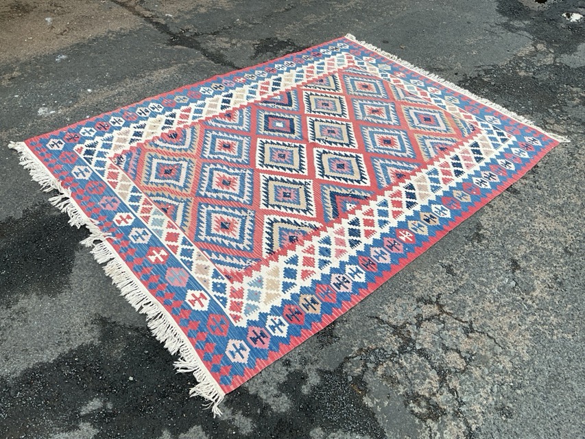 A Fars Qashqai kilim carpet with multicoloured zigzag lozenge pattern within geometric stepped square borders. (71in x 98in)
