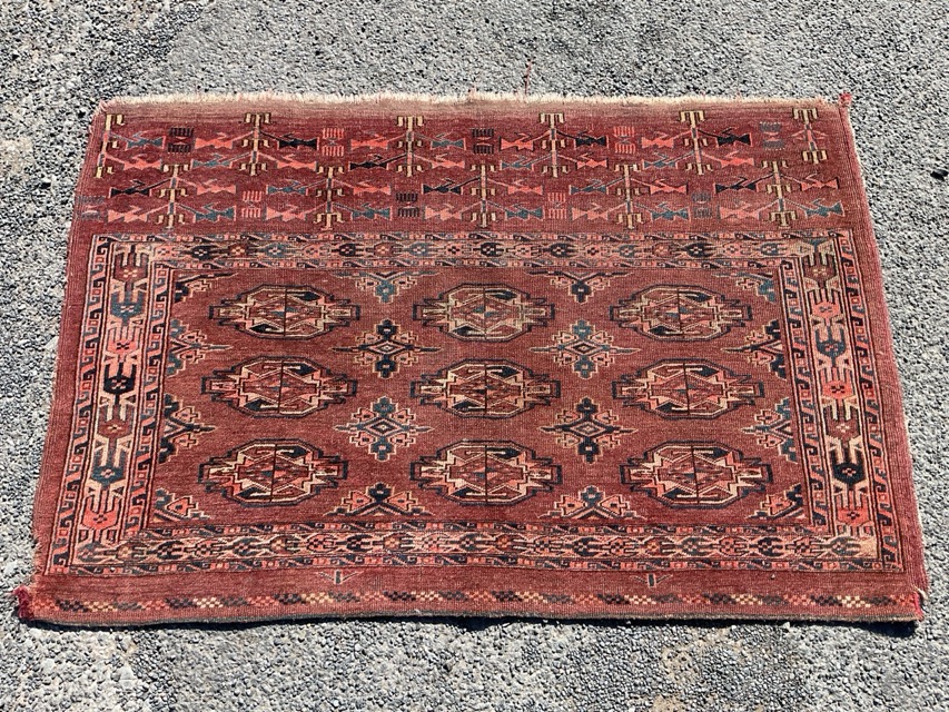 A Turkmen Arabachi wool rug woven with three rows of gul motifs on a red field within stylised leaf borders with a deep border of plant motifs to one side. (46in x 31in)