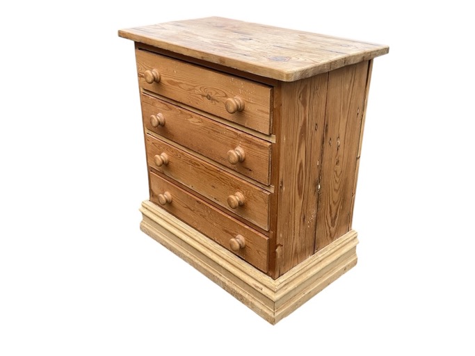 A small pine chest of four long knobbed drawers raised on moulded plinth. (24in x 13.75in x 25in)