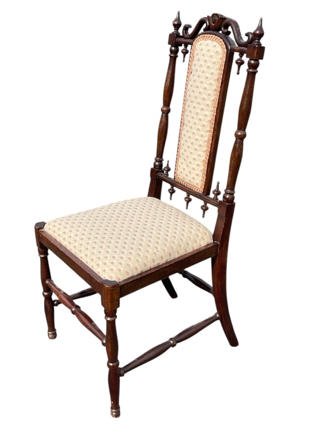 A mahogany William and Mary style parlour chair with scrolled back and padded splat flanked by turned supports with pointed finials, above a drop-in upholstered seat, raised on turned legs joined by conforming stretchers.