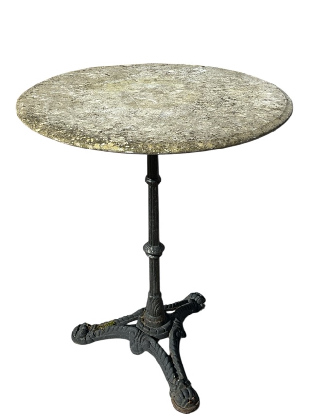 A circular Victorian garden table with moulded marble top on fluted cast iron column, the base with paw feet on ropetwist pierced supports. (23.5in x 29.75in)