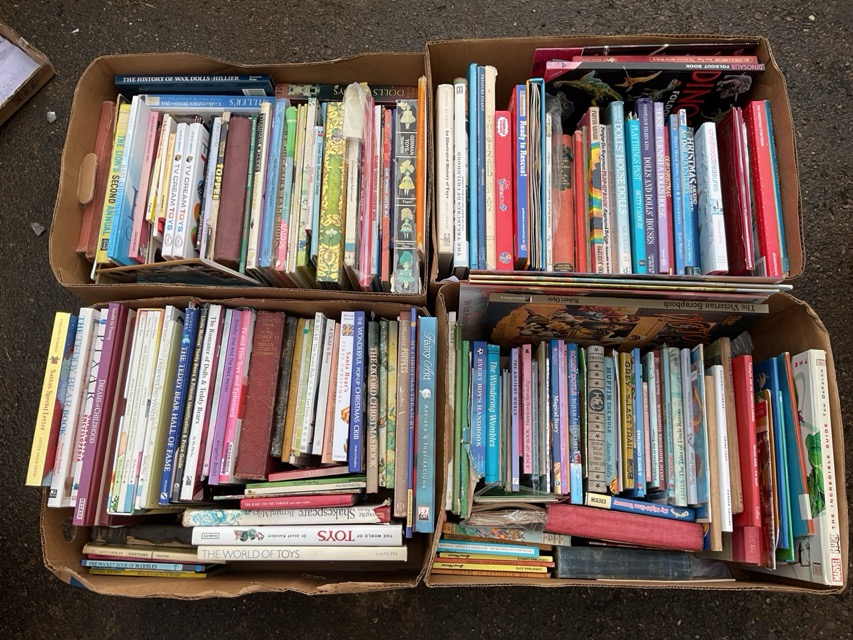 Four boxes of books - childrens stories and reference, dolls houses, toy and doll reference and collecting, Christmas books, fairies, picture books, etc. (approx 200)
