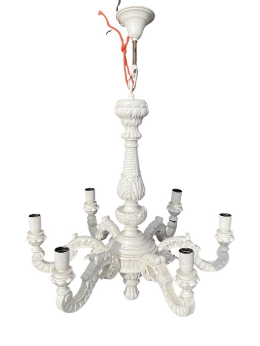A painted carved wood chandelier hanging light with six acanthus scrolled branches supporting lamps around a turned column with ribbed boss, beneath a bell shaped ceiling rose. (25in x 29in)