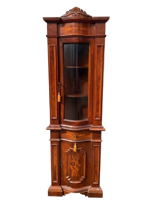 A European mahogany bowfronted corner cabinet with moulded carved crest cornice above a leaf inlaid frieze, with glass door framed by rectangular moulded panels, the base with conforming floral marquetry inlaid drawer and panelled door, supported on a moulded plinth. (26in x 15.5in x 82in)