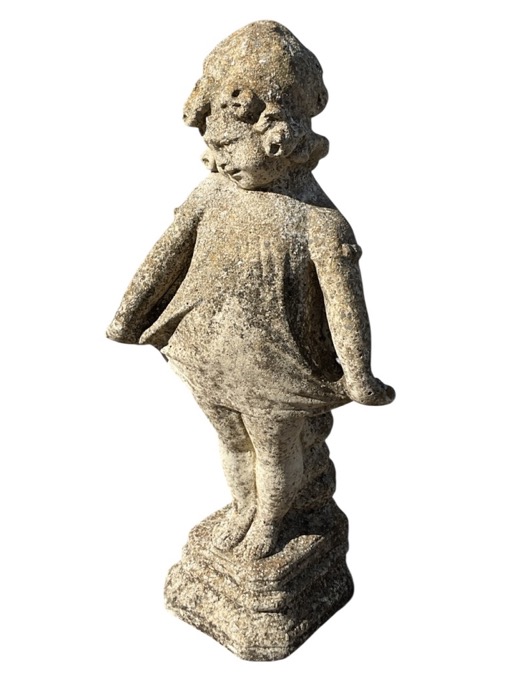 A composition stone garden statue modelled as a thirties child in bonnet & dress, standing on rectangular moulded plinth. (24in)