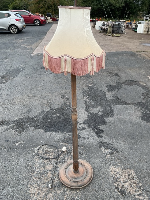An oak standard lamp with turned column and circular base and flaerd fabric shade. (58.5in)