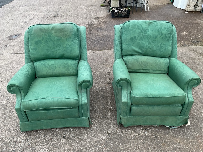 A pair of cotton damask upholstered armchairs with rectangular backs and seats with loose cushions flanked by outscrolled arms raised on castors. (2)