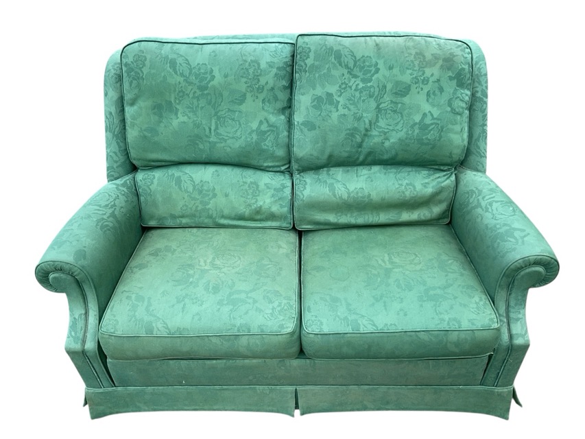 A cotton damask upholstered two-seater sofa with rectangular back and seat with loose cushions flanked by outscrolled arms raised on castors. (2)